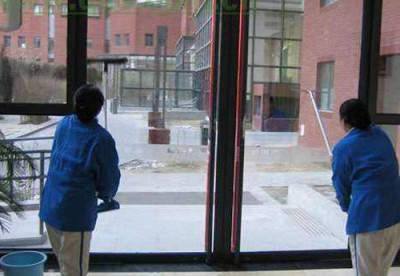 3、擦玻璃:先用云石铲刀和清洁球清除窗框和玻璃上顽固的污渍,然后用高压喷瓶将配好的玻璃清洁剂溶液均匀的喷到玻璃上,第三,用百洁布把玻璃框擦拭干净,第四,使用双面玻璃清洁器将玻璃擦干净,最后用玻璃刮将玻璃边的水痕擦干
